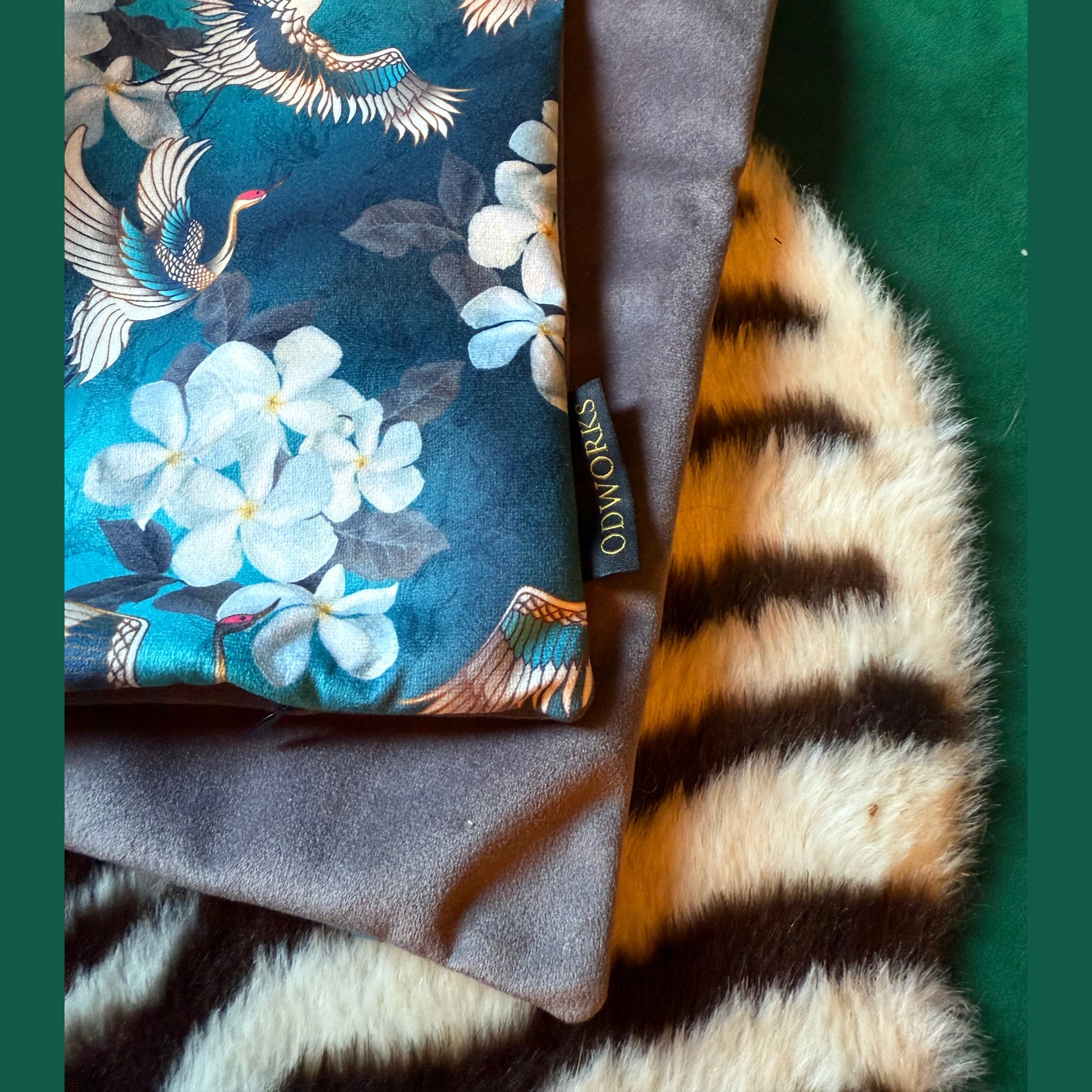 This beautiful teal/ turquoise velvet with diving cranes amongst blossoms. Lots of lovely details and accents on this print.