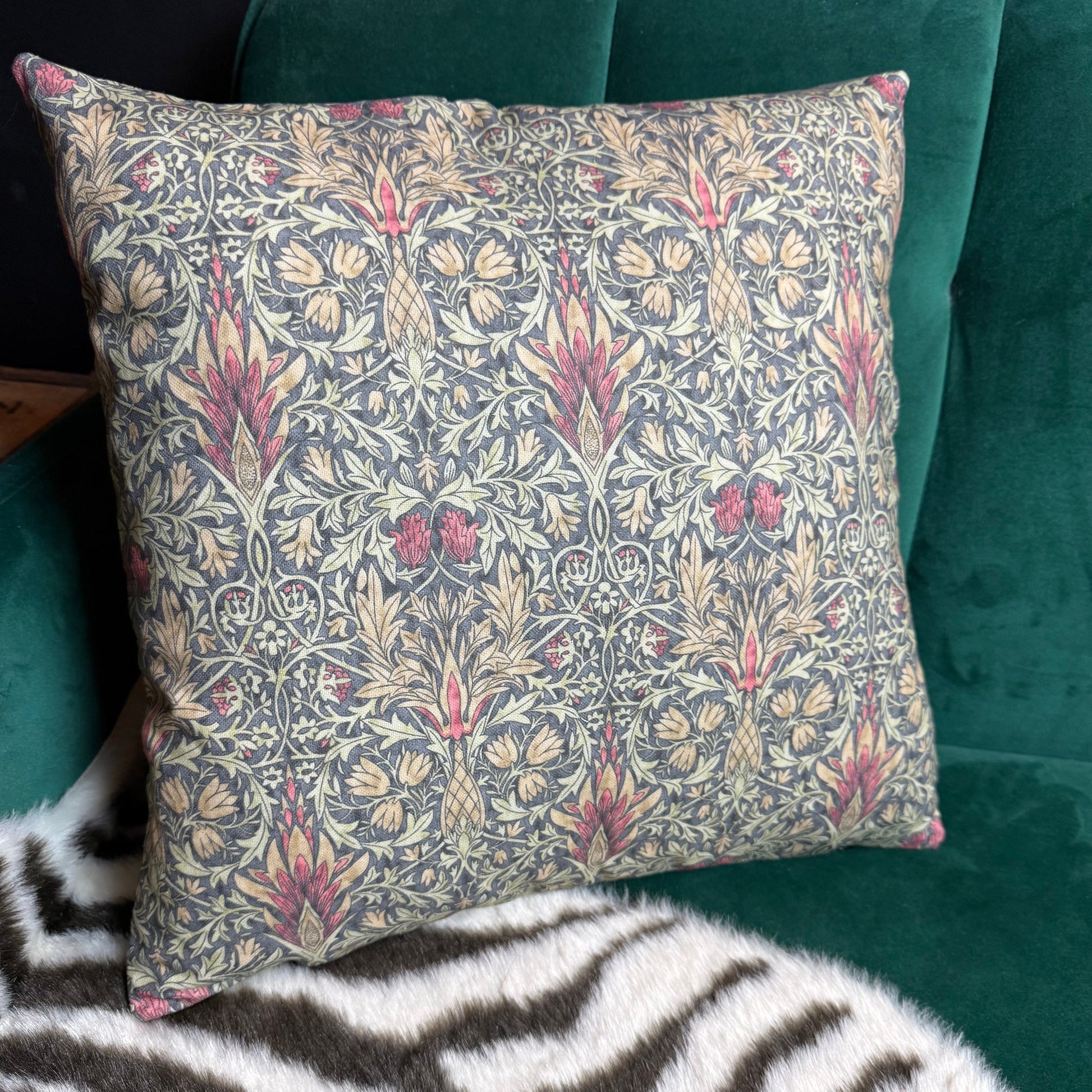 The William Morris snakeheads print, made from beautiful mocha colour cotton finished with a contrasting sage green velvet back.