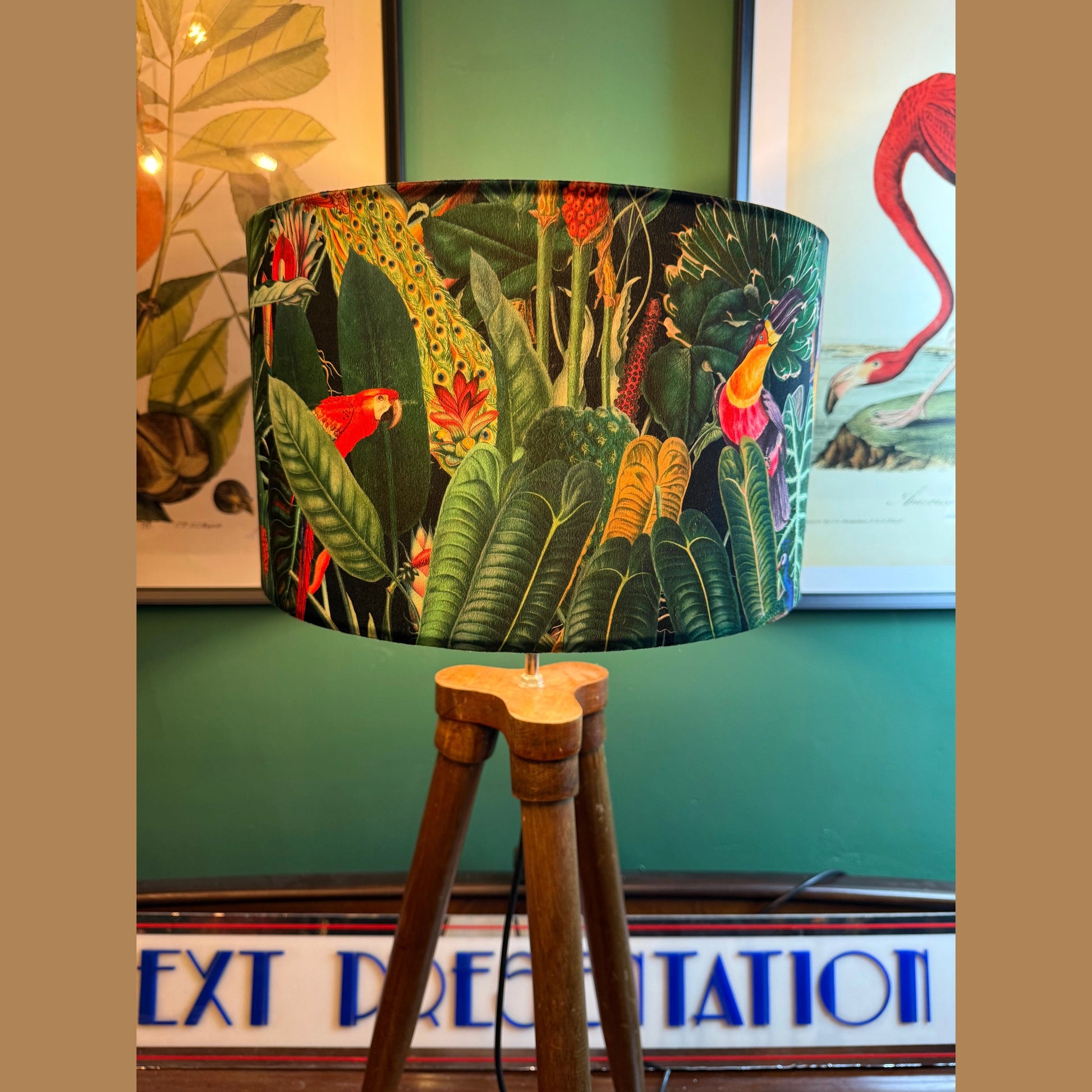 Rainforest black velvet lampshade parrot toucan palm peacock jungle