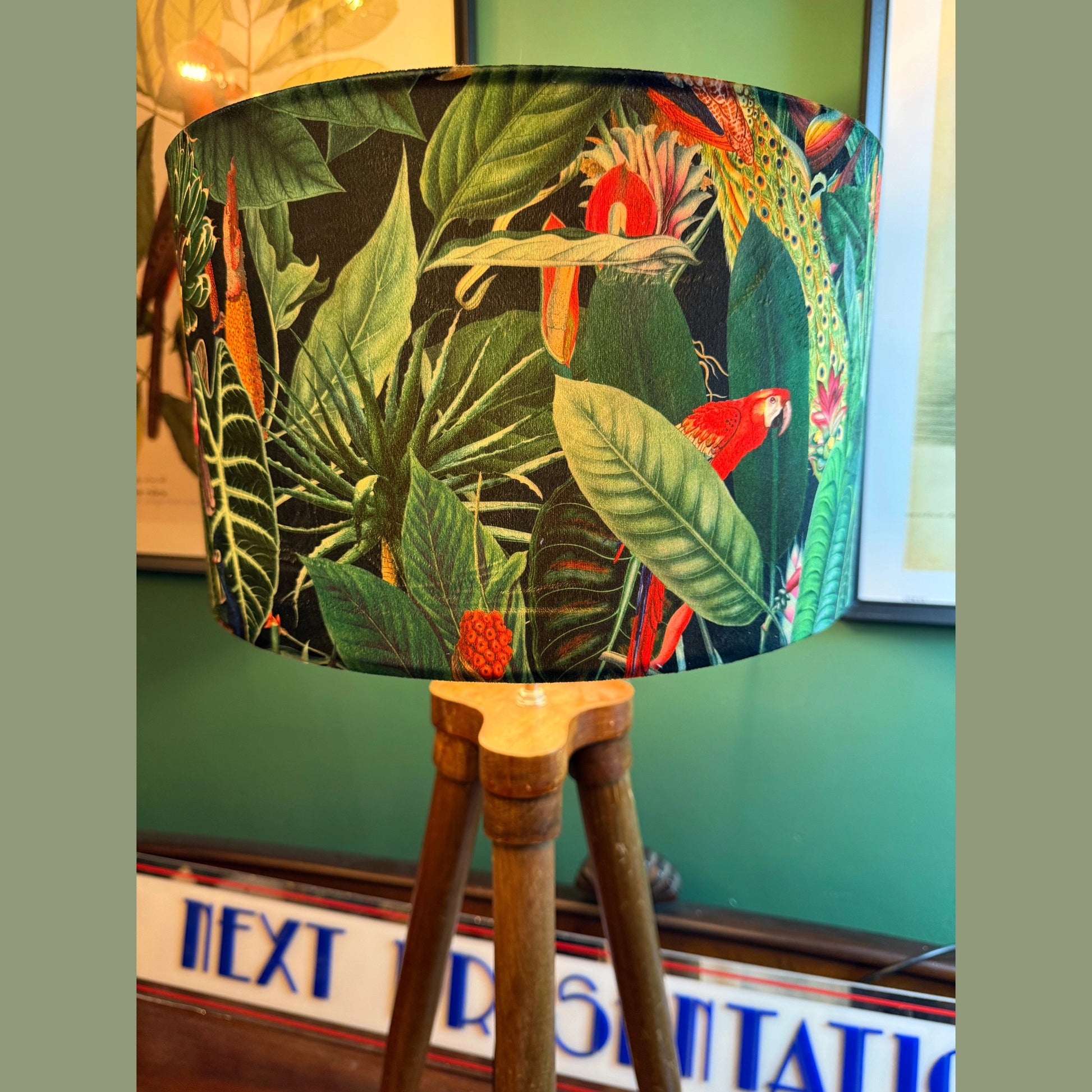 The rainforest lampshade is for you jungle lovers, if you’re looking for a colour pop then this dramatic print is for you. This amazing printed velvet has parrots, toucans and peacocks. This amazing design is also available with a black or white background.